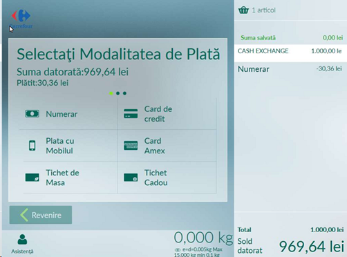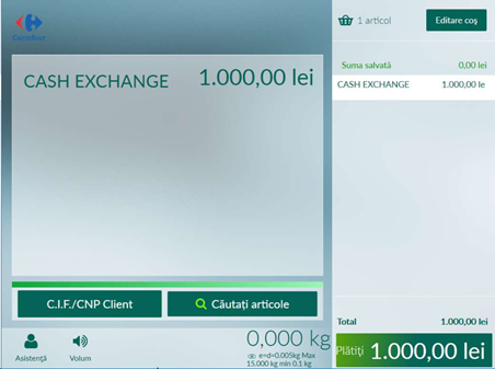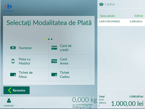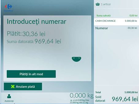 !! Daca se introduc bancnote cu valoare mai mare de 50,00 lei, SelfCheck-Out-ul va returna valoarea introdusa incepand cu denominarea de 50,00 lei.