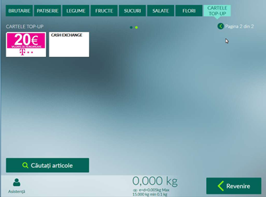 1. Se alege articolul din meniul “Cautare articole”, categoria “Cartele Top-Up”sau se scaneaza codul 909 – CASH EXCHANGE. Articolul va avea o valoare implicita de 1.000,000 lei.